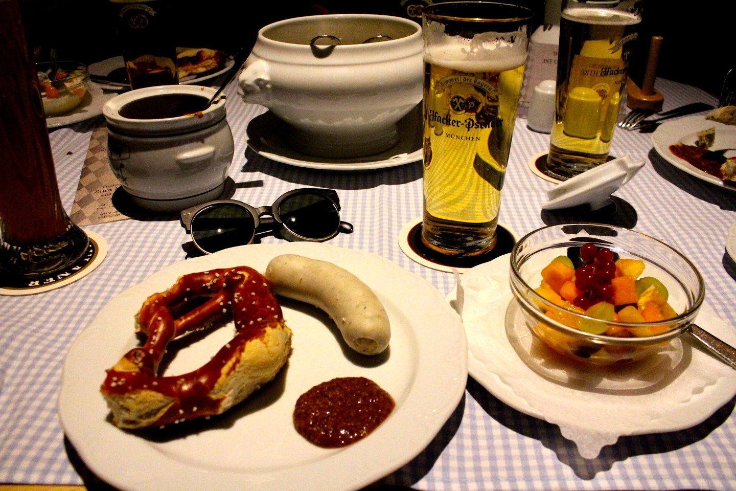 9 a.m. Our walking tour started at 10:40, so we wanted to gather our surroundings in the daylight and get breakfast before. We went to a restaurant and ordered the “traditional German breakfast” from the menu. It consisted of white sausage with sweet mustard, pretzels and sure enough…beer.